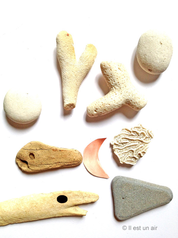 Quand j’étais enfant, nous partions toujours au bord de la mer avec mes parents, et nous adorions chercher des trésors laissés par la marée : morceaux de filets de pêche, hameçons, bois, galets joliment veinés (qui, hélas, perdaient tout leur intérêt une fois secs)…