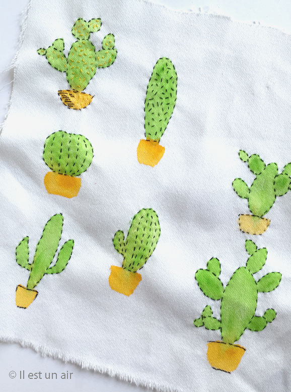 1- Peindre différents cactus sur une toile blanche, avec la peinture textile