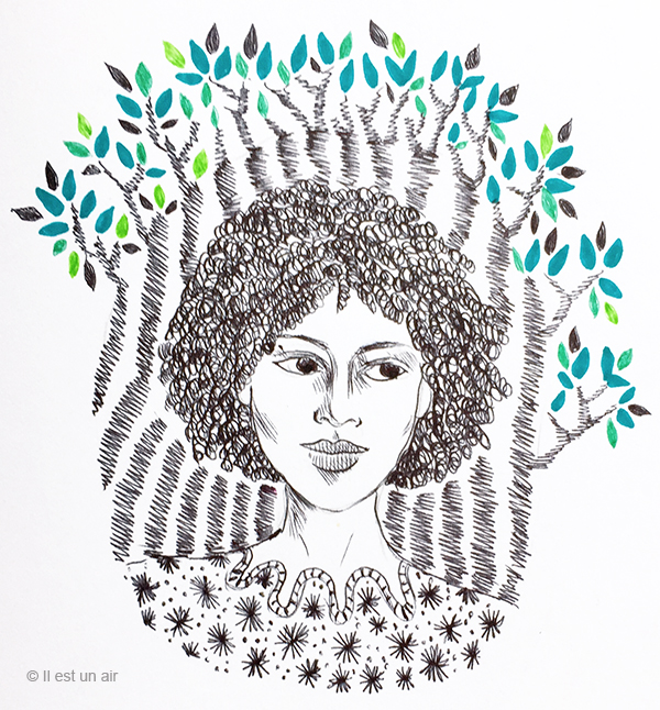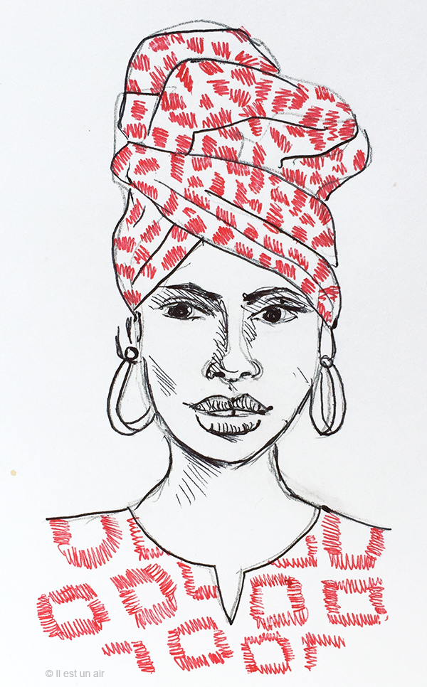 Alors, bien sûr, mes dessins au stylo bille prennent les couleurs de l’Afrique : j’enturbanne mes portraits, je multiplie les motifs et je mélange les genres. Ces dessins préparatoires me serviront sans doute à me remettre à mes peintures/broderies sur tissu que je délaisse depuis quelques temps… A suivre, donc.