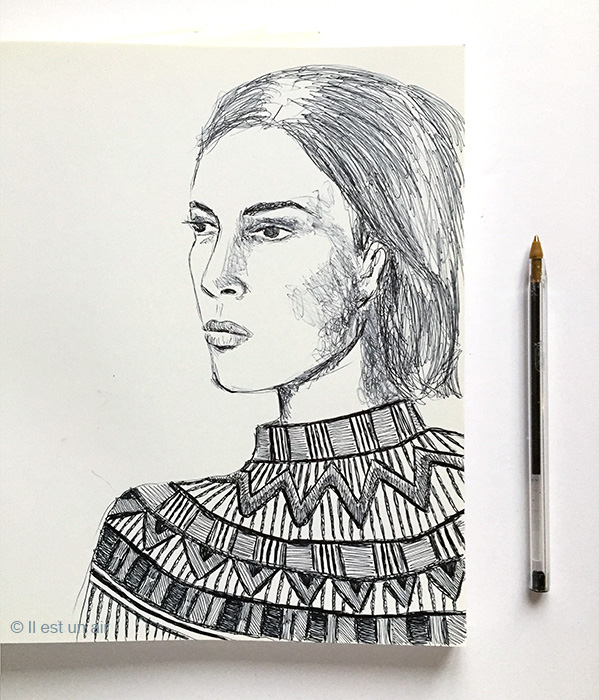 Le stylo à bille est est un moyen facile de griffonner, d’ombrer certaines zones et de donner des reliefs. De plus, il y a un côté définitif (on ne peut pas gommer !) que j’aime assez : il faut être certain de ses traits, repasser dessus pour corriger les erreurs… J’aime aussi le rendu, la finesse des traits, les nuances qu’un simple Bic noir peut apporter.