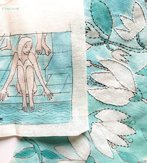 J’ai de nombreux ouvrages en cours. Ici, par exemple, une petite scène de piscine, puis un motif floral et un portrait que j’ai déjà commencé à broder.