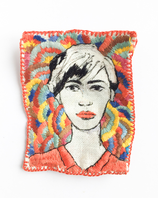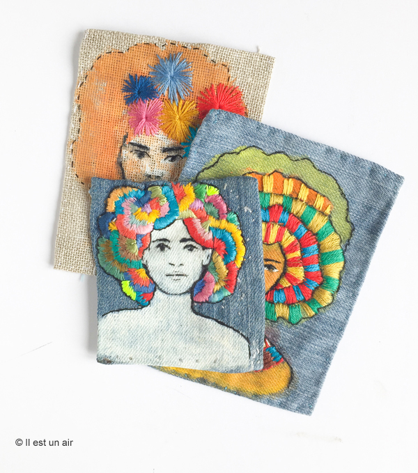 Je voulais terminer mon portrait brodé en cours, notamment utiliser le fil noir pour remplir totalement la zone des cheveux, et puis, j’ai décidé de laisser la broderie ainsi, un peu inachevée, comme une esquisse. Peut-être que demain, je déciderai du contraire et couvrirai de noir les cheveux…
