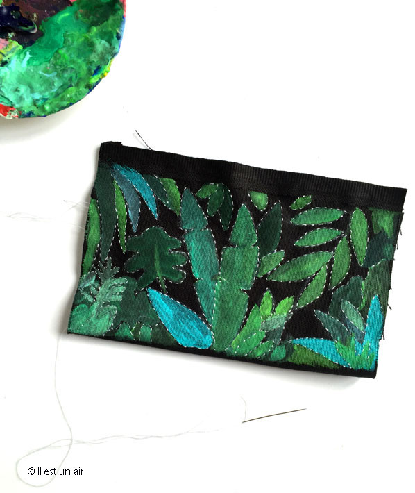 Ici, c’est une trousse aux tons verts et bleus, aux motifs jungle. Je l’ai confectionnée avec une toile noire, assez épaisse pour lui donner de la tenue.